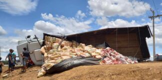 Caminhão carregado com flocos de milho tomba na BA-161, em Serra do Ramalho
