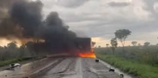 Motorista morre carbonizado após batida entre carro e caminhão na BR-242; veículos pegaram fogo
