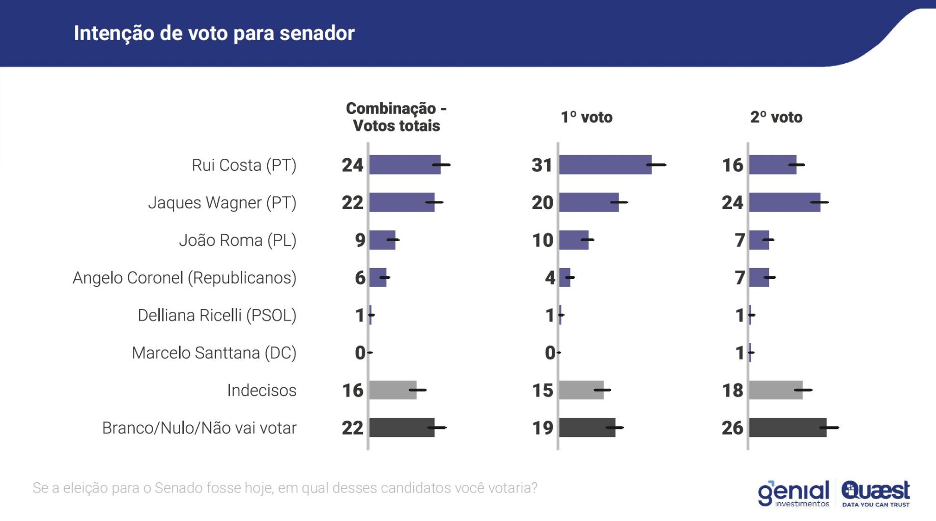 De acordo com os dados, Rui aparece com 24% das intenções de voto, seguido pelo senador Jaques Wagner (PT), que registra 22%. Na sequência, o ex-ministro João Roma (PL) soma 9%, enquanto o senador Angelo Coronel (Republicanos) aparece com 6%.