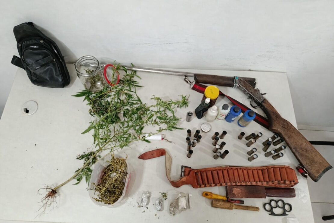 No local, foram apreendidos uma espingarda calibre 20 com numeração suprimida, cartuchos, insumos para recarga de munição e uma quantidade de substância análoga à maconha.