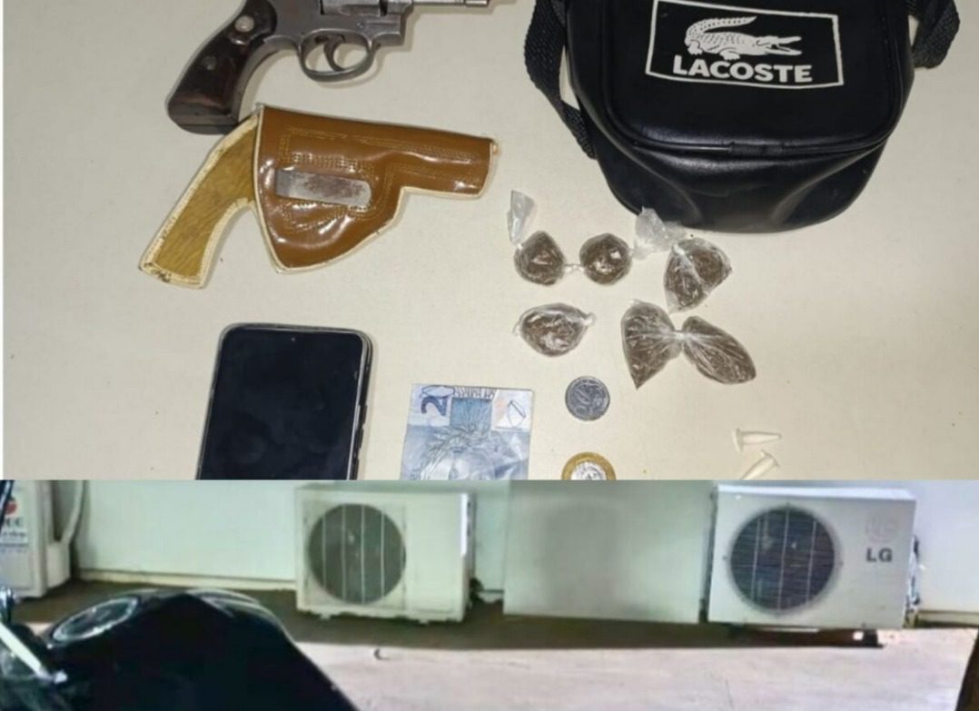 De acordo com a guarnição, o suspeito pilotava uma motocicleta com a placa dobrada, o que dificultava a identificação do veículo. Diante da irregularidade, foi realizada a abordagem e, durante a busca pessoal, os policiais encontraram uma arma de fogo tipo revólver calibre .32, com numeração suprimida, além de uma pochete contendo drogas.