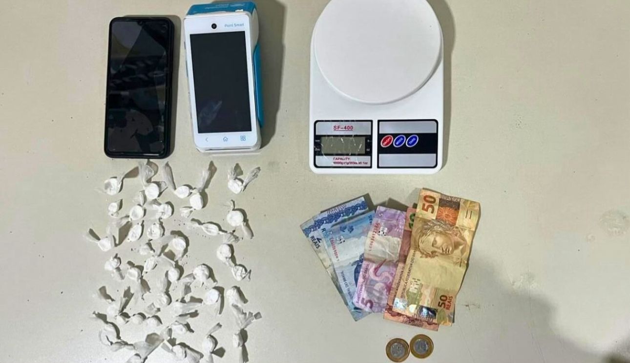 Durante a abordagem, os policiais apreenderam 37 porções de cocaína, além de uma máquina de cartão de crédito, um aparelho celular, uma balança de precisão e dinheiro em espécie, materiais comumente utilizados no comércio ilícito de entorpecentes.