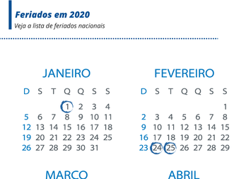 Páscoa e carnaval são feriados alongados em todos anos. A Paixão de Cristo (sexta-feira) será no dia 10 de abril. A segunda-feira e a terça-feira de carnaval cairão nos dias 24 e 25 de fevereiro, respectivamente.