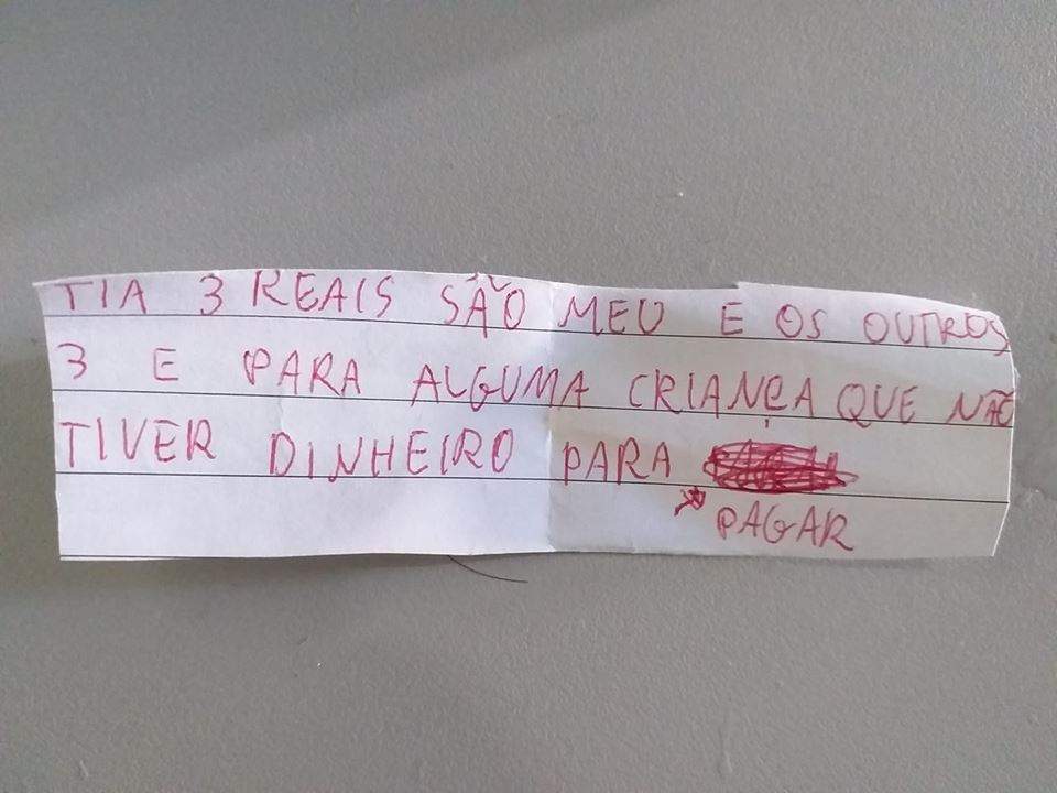 Apesar de não ser obrigatório, eles contribuíram, mas um recado em especial emocionou a professora Taciana Ferreira. Ao invés de entregar só os R$ 3 reais, como sugerido, uma aluna de 9 anos colaborou com R$ 6 e justificou em um recado: “Tia, R$ 3 reais são meus e os outros  R$ 3 são para alguma criança que não tenha dinheiro para pagar.”