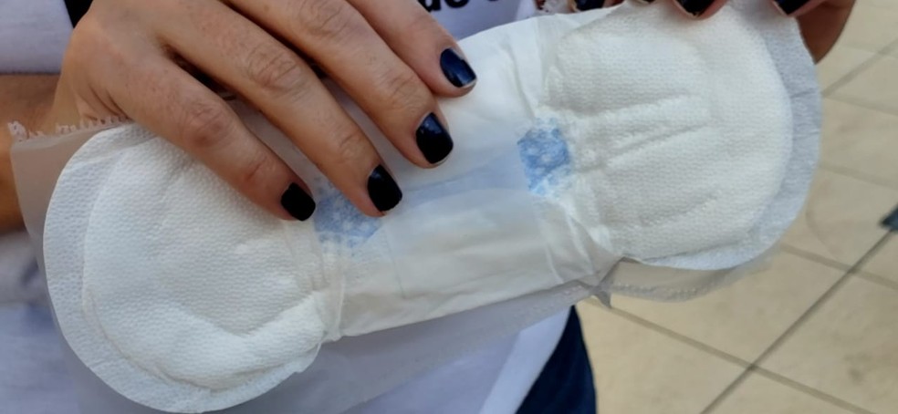Mulher segura um absorvente feminino — Foto: Alice Sousa/G1
