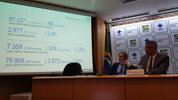 O secretário de Vigilância em Saúde, Wanderson de Oliveira, atualizou nesta segunda-feira (2) a situação do coronavírus no Brasil e no mundo. São 87.137 casos confirmados em todo globo, com registro de 2.977 óbitos e letalidade global. Atualmente, 58 países já registraram casos de coronavírus. No País, após a mudança de metodologia de cálculo, são 433 suspeitos, dois confirmados e 162 descartados.