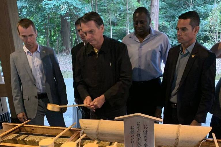 Nem bem pousou no Japão, o presidente Jair Bolsonaro fez nesta segunda-feira (21) um rápido roteiro turístico por Tóquio, em esforço para se adaptar ao fuso horário de 12 horas à frente do Brasil. Em uma tentativa de saída furtiva, que acabou descoberta pela imprensa, ele foi ao templo xintoísta Meiji, um dos mais conhecidos da capital japonesa, onde participou de uma espécie de ritual de purificação.
