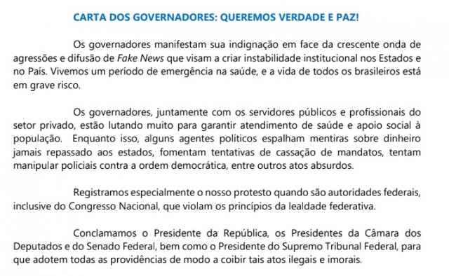 Os governadores manifestam sua indignação em face da crescente onda de agressões e difusão de Fake News que visam a criar instabilidade institucional nos Estados e no País. Vivemos um período de emergência na saúde, e a vida de todos os brasileiros está em grave risco.