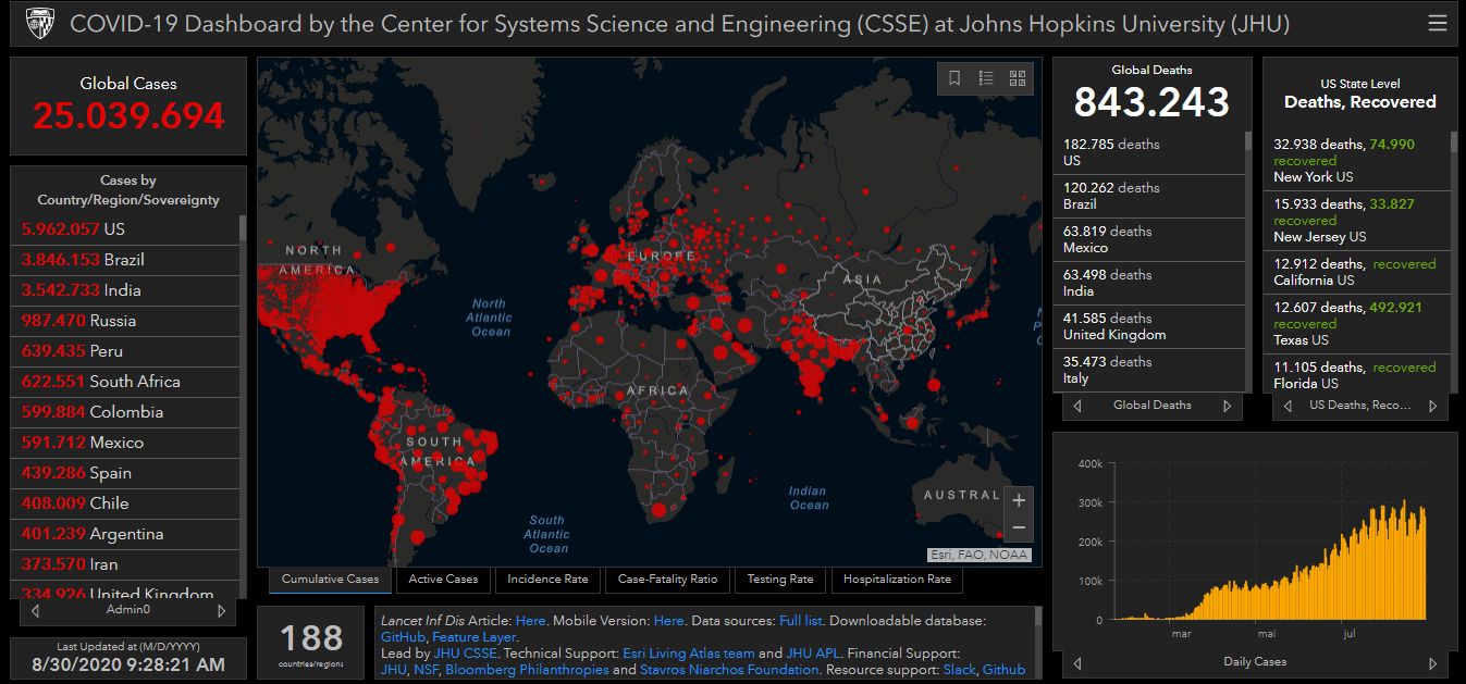 Mais de 25 milhões de casos de coronavírus foram registrados no mundo, de acordo com a Universidade Johns Hopkins até este domingo (30). Ao todo, 25.039.694 pessoas foram infectadas e 843.243 morreram em função da doença.