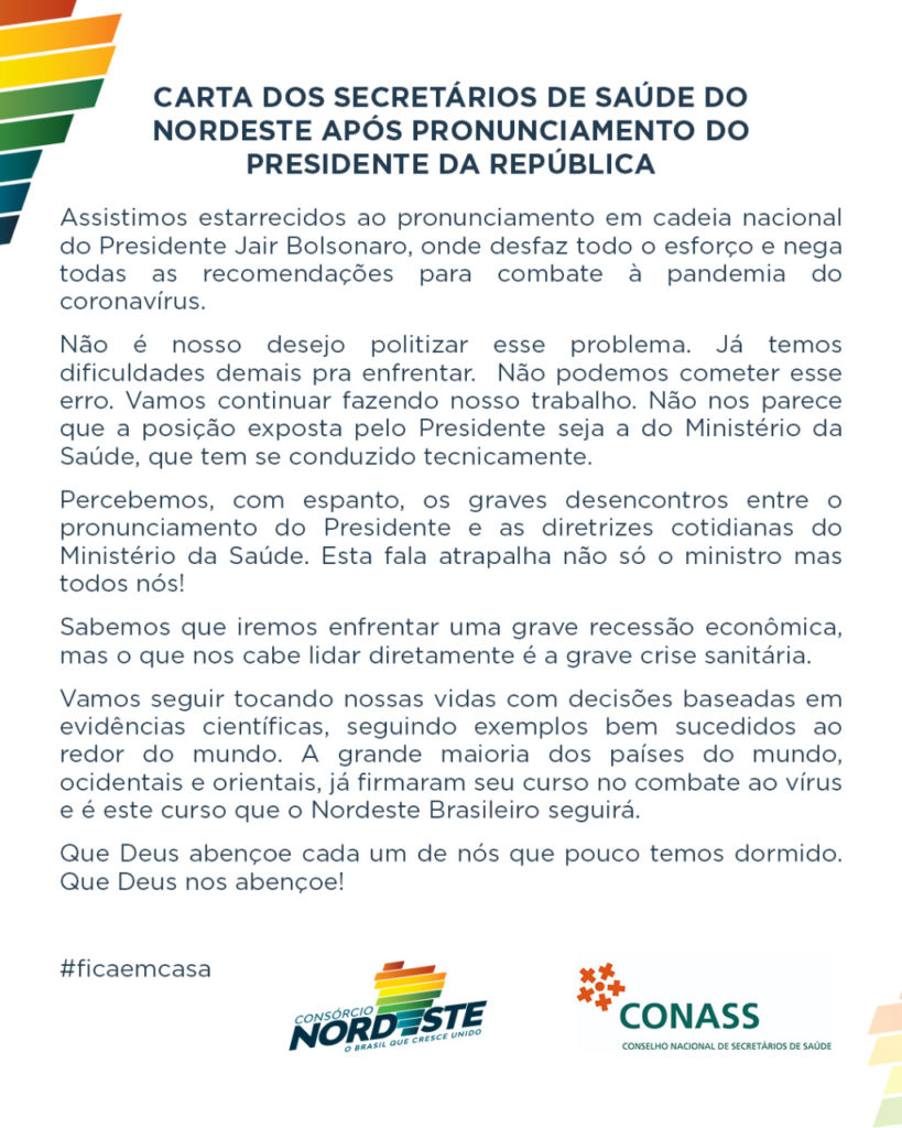 Os Secretários de Saúde do Nordeste se manifestaram através de uma carta repudiando o pronunciamento do presidente Jair Bolsonaro, na noite desta terça-feira (24). Na carta, os secretários afirmaram que assistiram o pronunciamento estarrecidos após o presidente pedir reabertura do comércio e escolas e fim do ‘confinamento’.