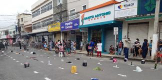 Moradores de cidade na Bahia usam capacetes e bancos plásticos para marcar lugar em fila de auxílio emergencial