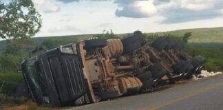 Carreta carregada com trigo tomba na BR-430, entre Igaporã e Caetité