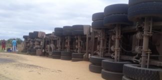 Em Muquém do São Francisco, carreta carregada com soja tomba na BR-242