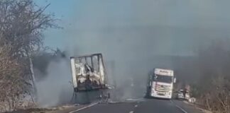 Carreta com óleo vegetal pega fogo na BR-242, em Muquém de São Francisco