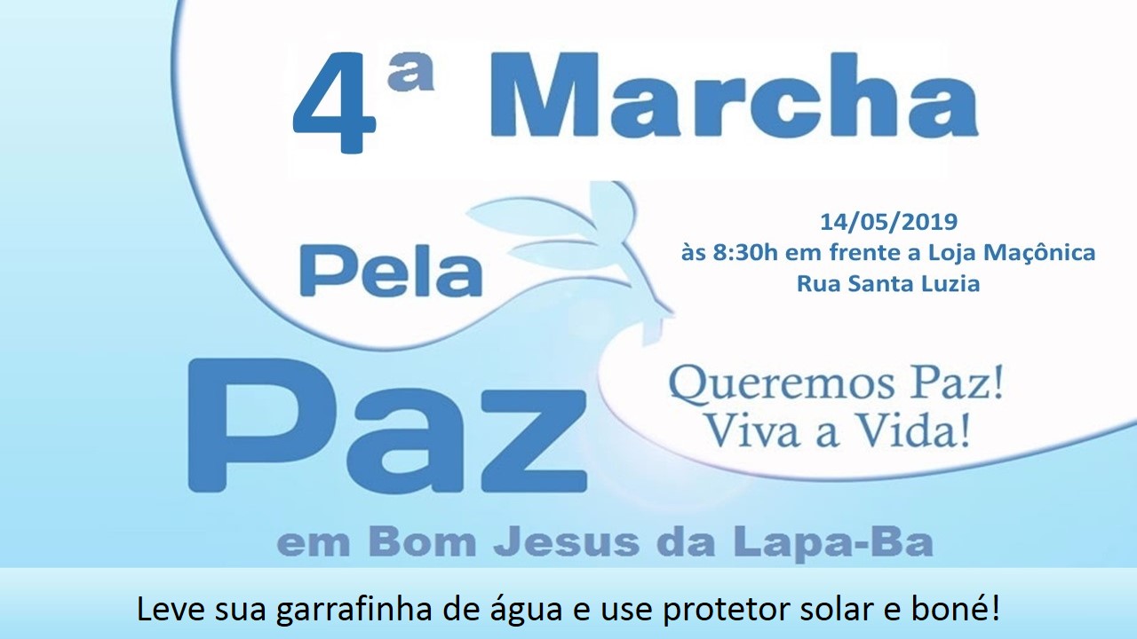 Acontece nesta terça-feira, 14 de abril, em Bom Jesus da Lapa, a 4º Marcha pela Paz. A passeata tem concentração às 8h30 , saindo de frente da Loja Maçônica Luz e Liberdade, ao lado do Posto Santa Luzia, com destino à Praça Marechal Deodoro da Fonseca, onde será entregue a premiação aos alunos da rede municipal, vencedores do Concurso de Redação, e apresentada a mensagem da Comissão Permanente pela Paz.