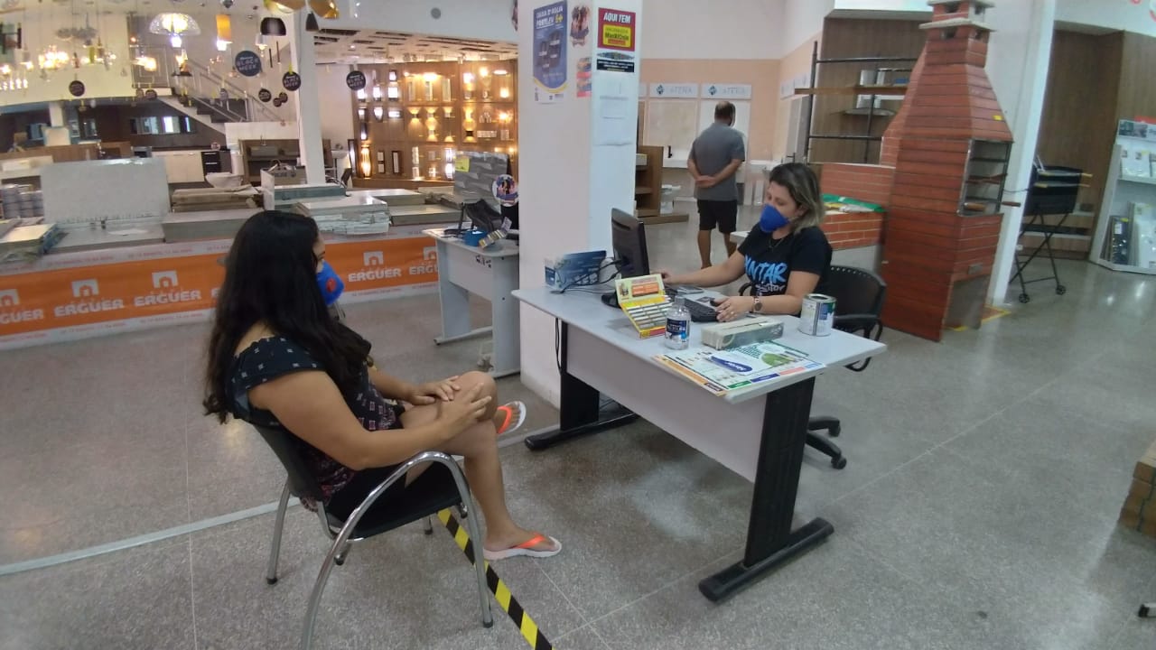 Na hora de fazer o pagamento no caixa da Rede Erguer Construcosta o cliente é orientado manter uma distância conforme o sinal no chão.