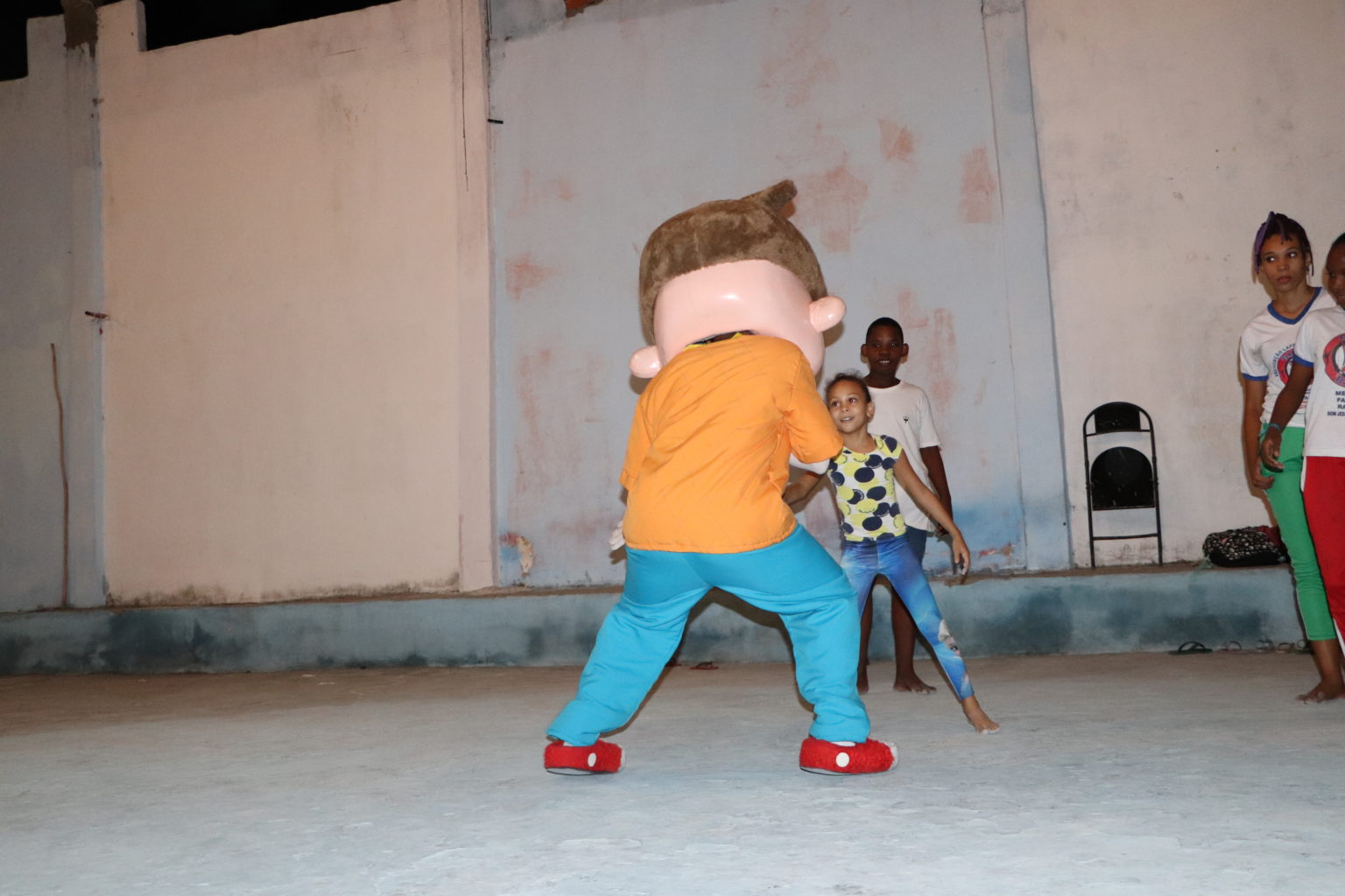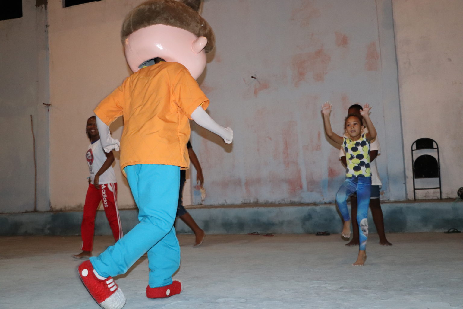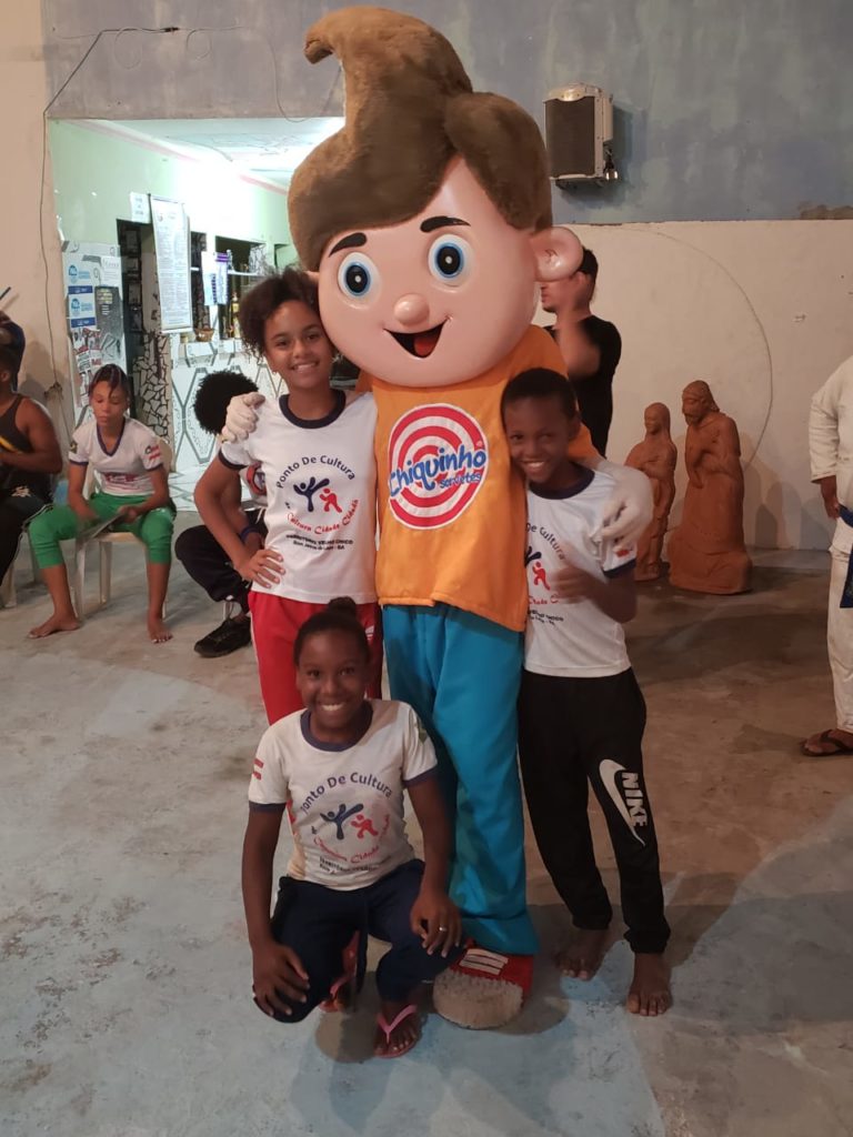 Mascote do Chiquinho Sorvete com as crianças atendidas pelo projeto