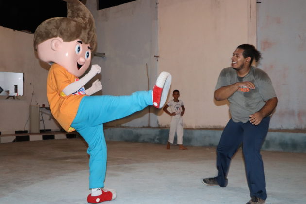 Durante a ação o Mascote do Chiquinho Sorvete participou da roda de capoeira com a criançada, que aproveitaram para tirar foto e se divertir.