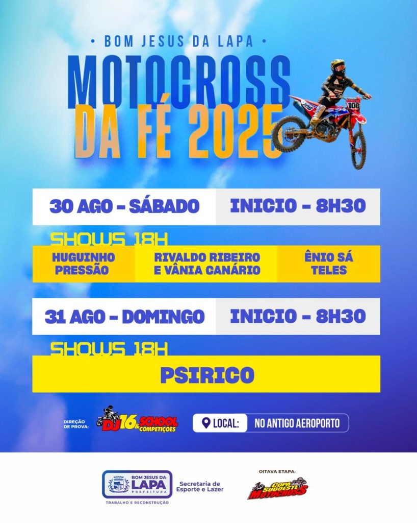Como parte das comemorações pelos 102 anos de emancipação política de Bom Jesus da Lapa, a cidade vai receber uma programação especial nos dias 30 e 31 de agosto, com destaque para o tradicional Motocross da Fé e uma atração musical surpresa anunciada pelo prefeito Eures Ribeiro.