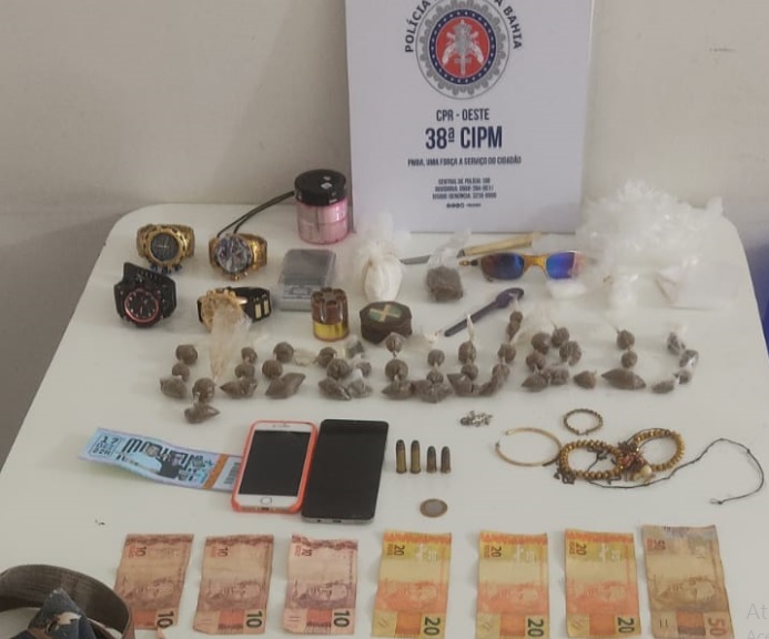 Conforme cita a ocorrência, os Policiais Militares da 38ª CIPM foram acionados para averiguar o crime de tráfico. Chegando ao local, confirmaram o cometimento e prenderam em flagrante delito, um indivíduo em posse de drogas e objetos utilizados no crime ou como pagamento dele, sendo: 45 porções de maconha, 01 porção de cocaína , 04 munições de arma calibre . 38, dinheiro em espécie, 01 balança de precisão, 04 relógios e 02 celulares.