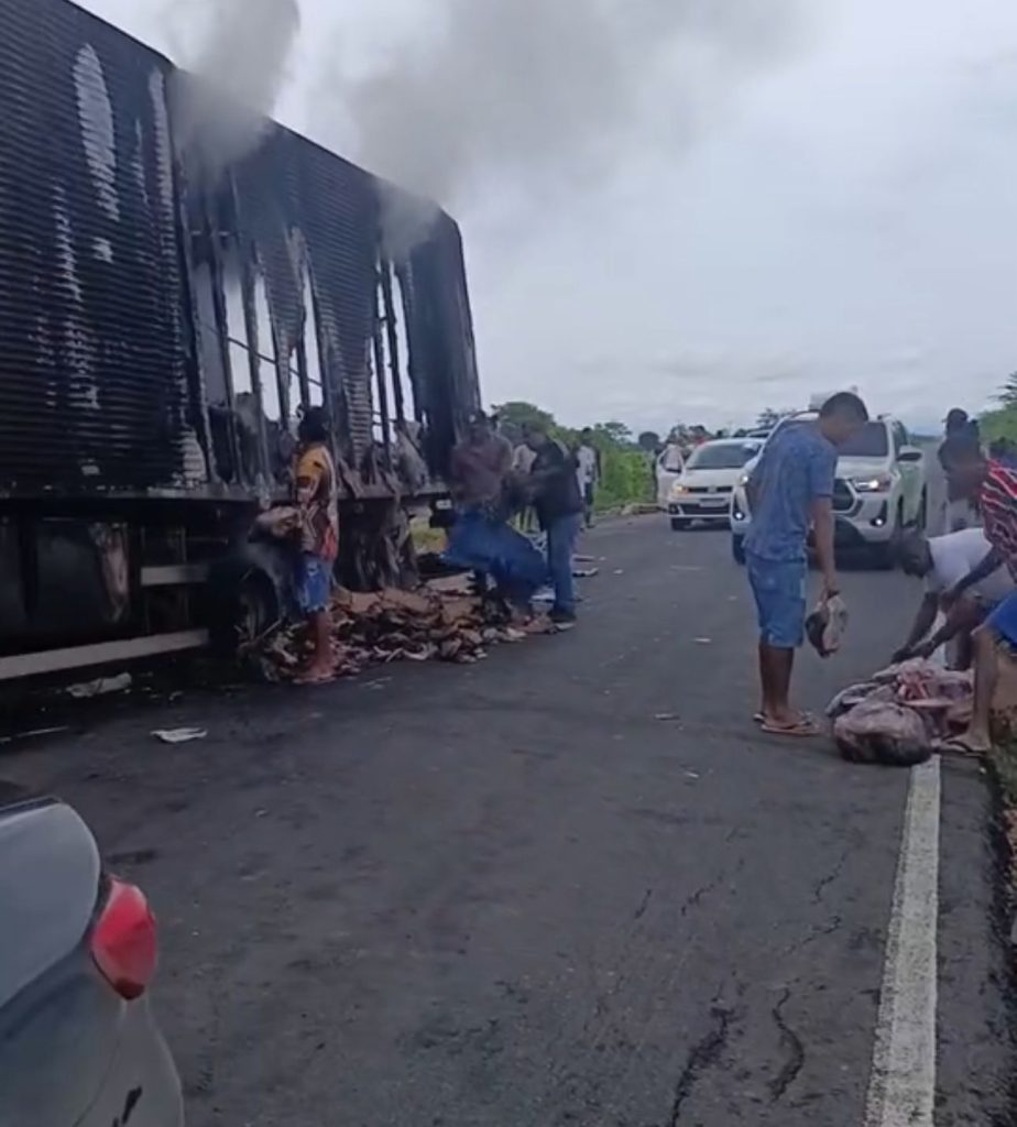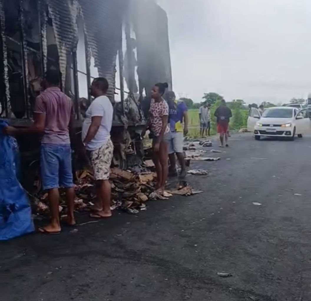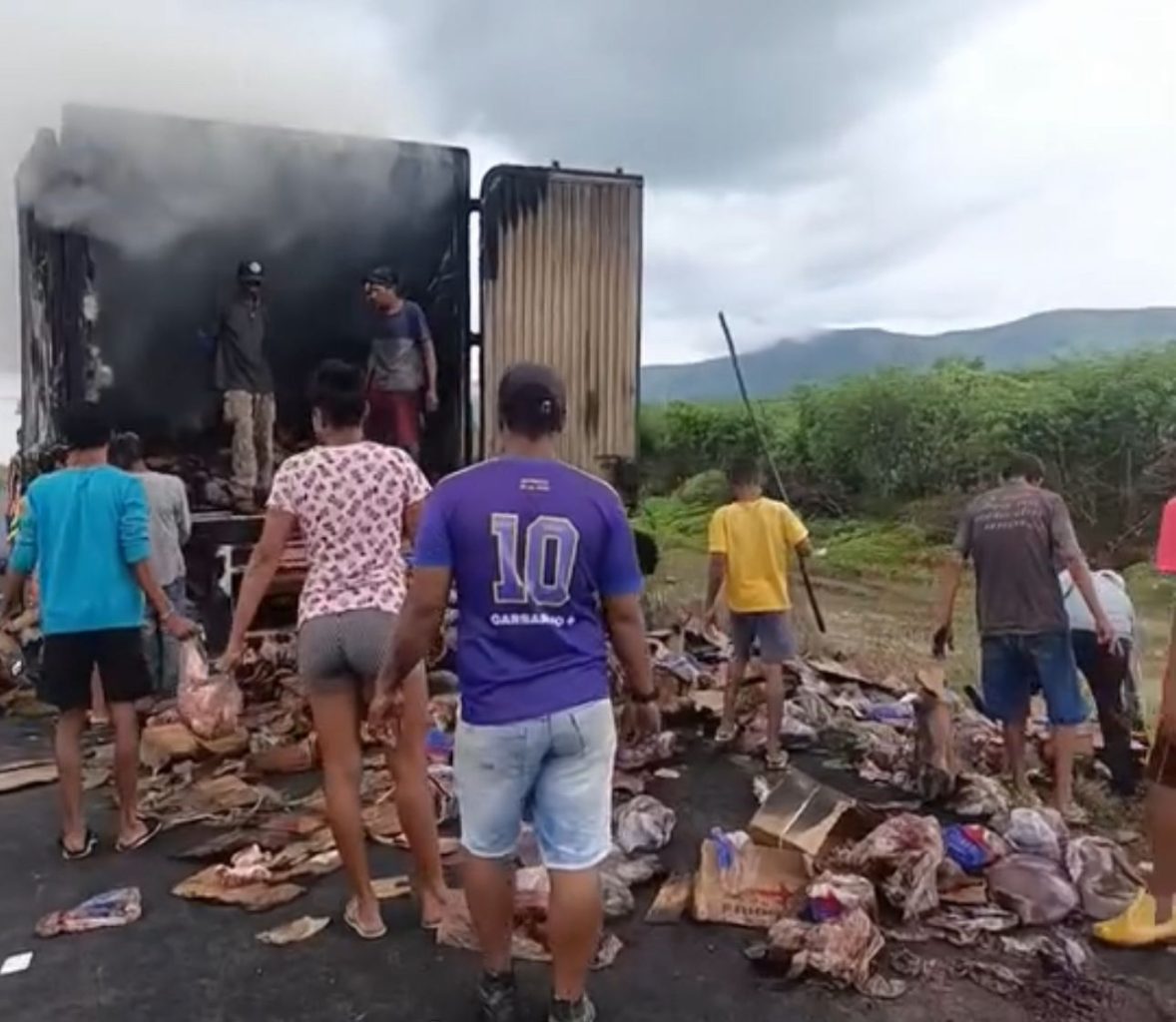 Na manhã deste domingo (7), moradores da região foram até o trecho da rodovia para recolher a carga que ficou espalhada pela pista. Parte dos produtos estava intacta, enquanto outra porção foi completamente queimada pelo fogo.