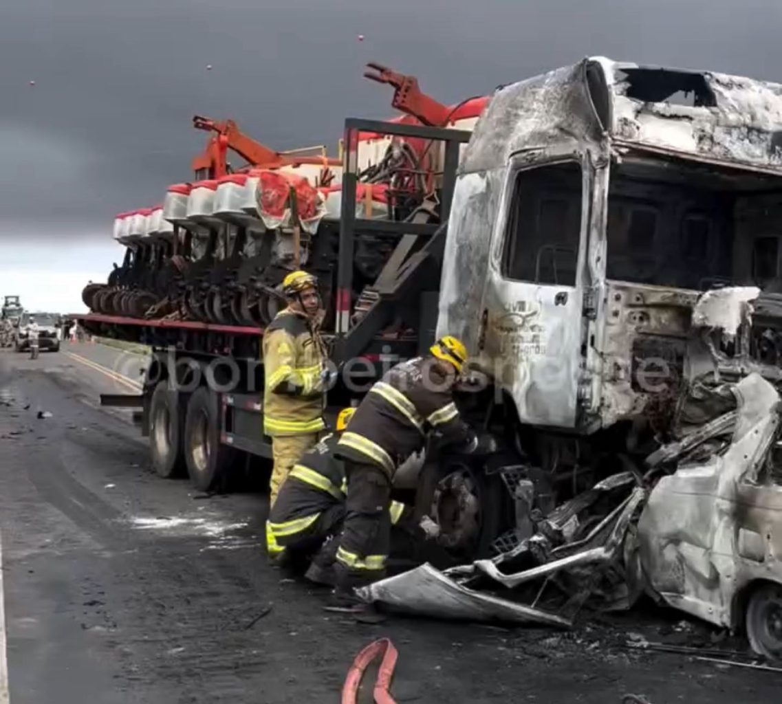 A colisão frontal envolveu uma Fiat Strada e um caminhão que transportava máquinas agrícolas, nas proximidades do trevo com a BR-020. Segundo informações, o carro teria invadido a contramão, provocando o impacto.