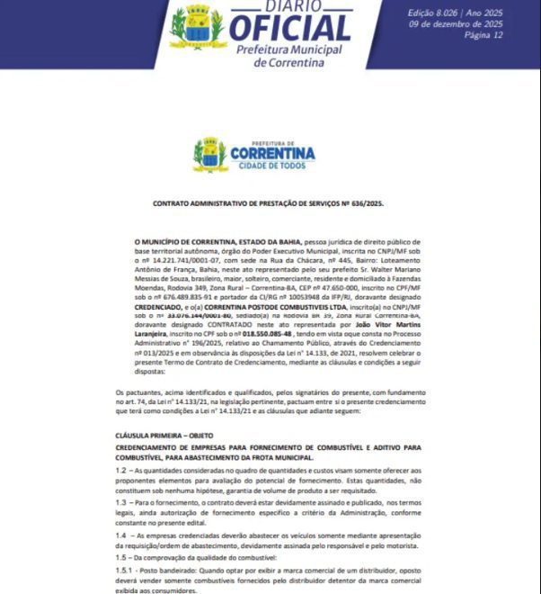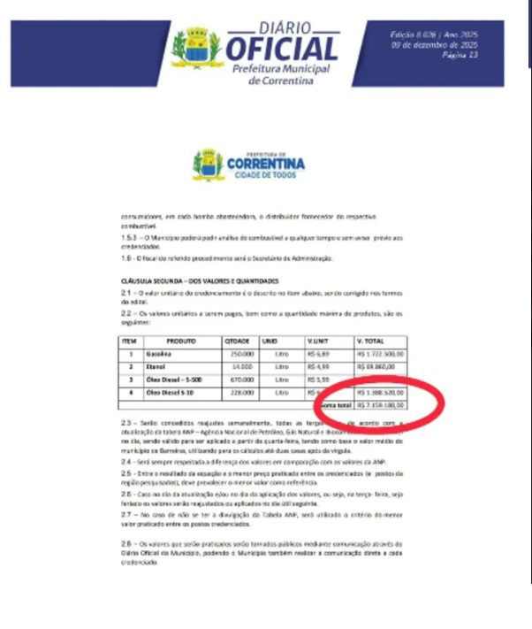 Um contrato milionário firmado pela Prefeitura de Correntina, no oeste da Bahia, para o fornecimento de combustíveis tem gerado repercussão pelo volume contratado e pelo curto período de vigência. Na gestão do prefeito Mariano Correntina (União Brasil), o município assumiu um compromisso de R$ 7 milhões para abastecer a frota pública durante apenas cinco meses.