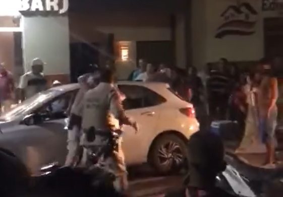 Ainda segundo a corporação, durante a tentativa de prisão, o homem resistiu e iniciou um tumulto. Vídeos feitos por populares mostram uma mulher tentando intervir na abordagem e sendo empurrada por um policial, vindo a cair no chão. Em seguida, o suspeito entra em confronto físico com um dos policiais, e um capacete é arremessado em direção à guarnição.