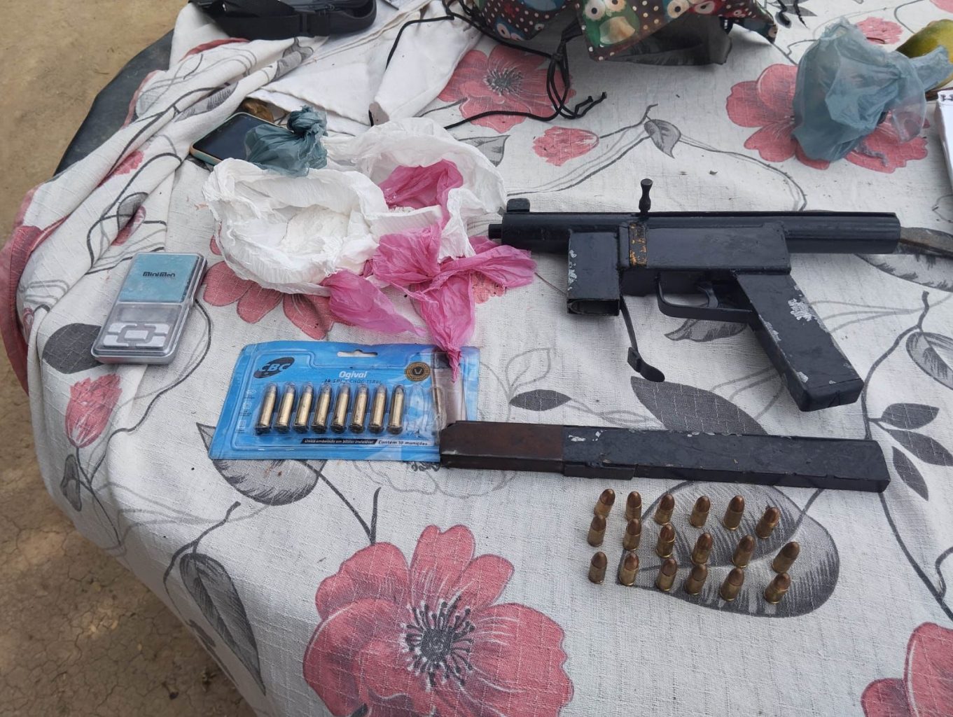 Durante a ação, os policiais encontraram uma submetralhadora calibre 9mm, diversas munições, além de drogas, balança de precisão, uma motocicleta com chassi suprimido e o próprio veículo utilizado pelo suspeito. Todo o material foi imediatamente apreendido.