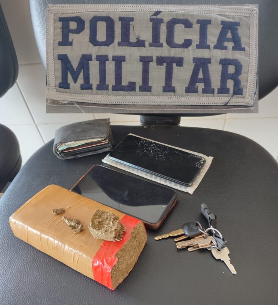 Na abordagem, os policiais encontraram com o passageiro um tablete de substância semelhante à maconha, pesando cerca de 400 gramas. A motocicleta, uma Honda CG 150 de cor vermelha, foi verificada no sistema MOP e não apresentava restrições.