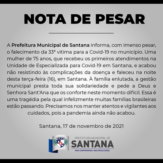Segundo a nota, trata-se de uma mulher de 75 anos que recebeu os primeiros a atendimentos na “Unidade Especializada para Covid-19 ” da cidade, e acabou não resistindo às complicações da doença e faleceu na noite desta terça-feira(16), em Santana. Entretanto não foi informado os detalhes sobre a paciente e nem a situação do falecimento.