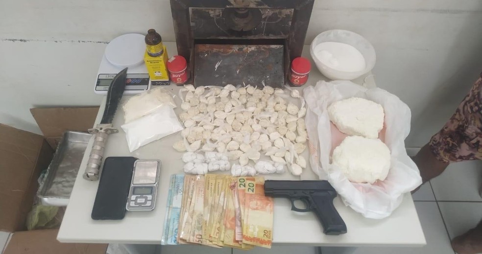 Ao chegarem ao imóvel indicado, havia outro menor e com ele foram apreendidos um simulacro, 162 porções de cocaína e 688 gramas da mesma, R$ 1470, duas balanças, dois potes de fermento e um com pó branco, um frasco de substância analgésica, uma prensa, uma faca e embalagens para armazenamento das drogas.