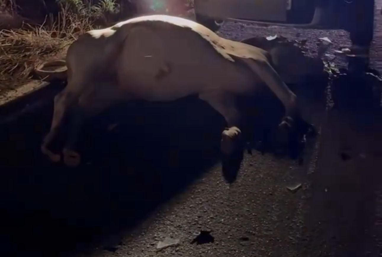 De acordo com as informações, um animal solto atravessou a pista e foi atingido por um veículo que trafegava pela rodovia. Com o impacto, a cabeça do animal atingiu o para-brisa, causando danos também ao farol do carro. Apesar do susto, ninguém ficou ferido.