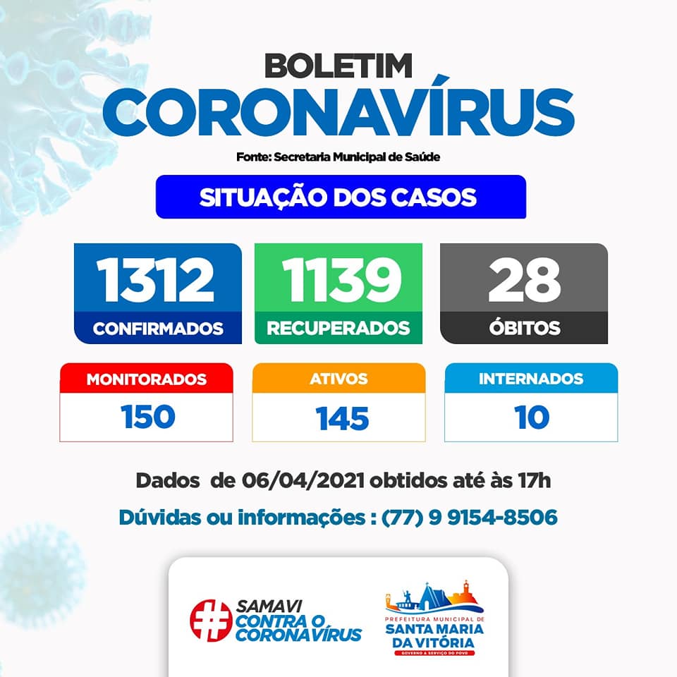 Santa Maria da Vitória registrou mais três casos de Covid nesta terça e chegou a 1.312 casos confirmados. O número de recuperados subiu para 1.139, 45 ativos, 10 internados, 150 monitorados e 28 pessoas morreram por complicação da doença.