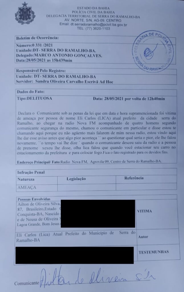 De acordo com Aílton, no Boletim de Ocorrência registrado na Delegacia Territorial de Serra do Ramalho, ele foi vitima de ameaça pelo atual prefeito do município, Eli Carlos (LICA). De acordo com o apresentador, Lica foi até a emissora de radio Nova FM acompanhado de quatro homens, seguranças do mesmo, o chamou em particular e disse “estou te chamando aqui porque eu não aguento mais falarem de mim nessa rádio [Nova FM]. Estou vindo aqui lhe dar esse aviso antes que algo pior aconteça — ao questionar qual seria o pior, ele lhe falou novamente “o tempo vai lhe dize (sic)” .