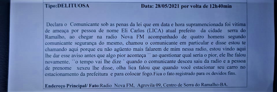 O radialista, Ailton de Oliveira Silva, conhecido como Aílton Alegria registrou nesta sexta-feira(28) um boletim de ocorrência contra o prefeito de Serra do Ramalho, Lica (PSDB), alegando ter sido ameaçado pelo gestor antes de iniciar uma entrevista na Rádio Nova FM com o ex-prefeito de Bom Jesus da Lapa, Eures Ribeiro.