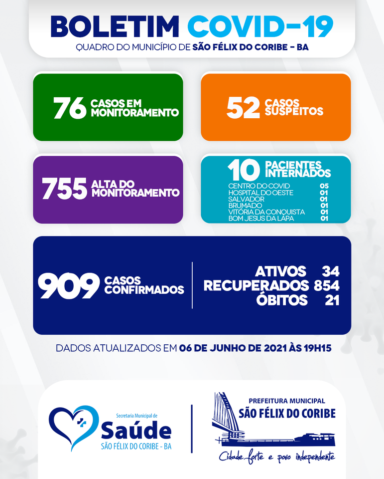 Mais dois óbito por complicações da Covid-19 foram registrados em pacientes de São Félix do Coribe A informação foi divulgada no Boletim Epidemiológico da Secretaria Municipal de Saúde, deste domingo(6).
