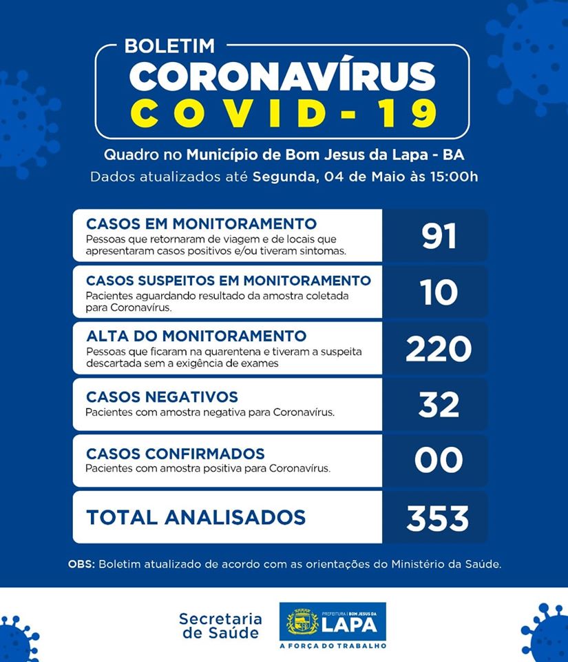 A Secretaria de Saúde de Bom Jesus da Lapa divulgou na tarde desta segunda-feira(4), o boletim com os números do novo coronavírus no município.