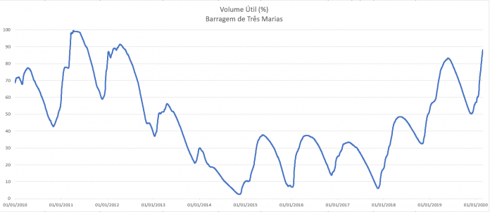 O maior volume de água entrou na barragem no dia 25 de janeiro, quando forte e intenso em várias regiões do Estado de Minas Gerais. A afluência neste dia chegou a 4.000 m³/s. Com o aumento do volume, a defluência foi aumentada nos últimos dias, passando de 290 m³/s para 460 m³/s nesta quarta-feira.